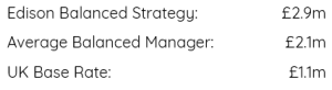From April 2009 to October 2023, Edison’s balanced strategy returned 187%. The average balanced manager returned 113%. Meanwhile, leaving your money on deposit earning interest at the UK base rate would have returned 11%. It is worth noting that for most of this period it was near impossible to find a savings account paying the base rate.